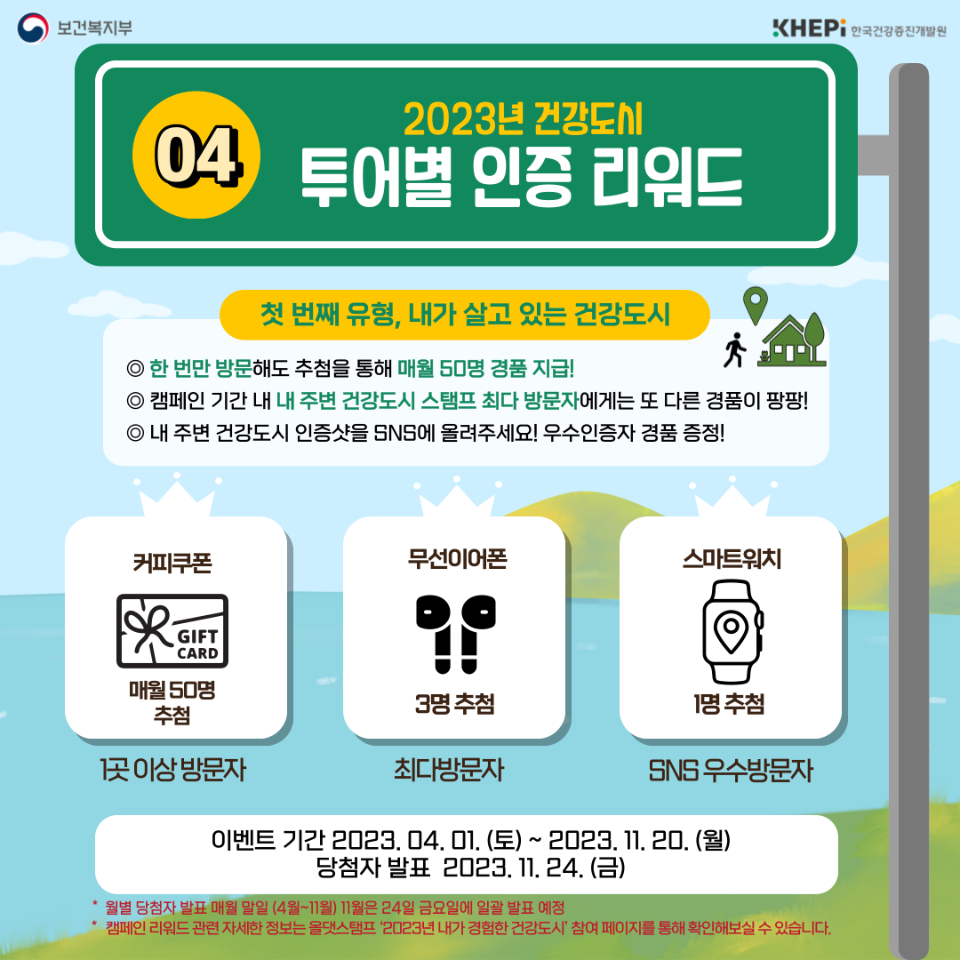 - '내가 살고 있는 건강도시 유형' 내 1곳 이상 방문시 추첨을 통해 매월 50분께 드리는 경품(커피쿠폰)은 타 경품과 중복 수령이 가능합니다.
