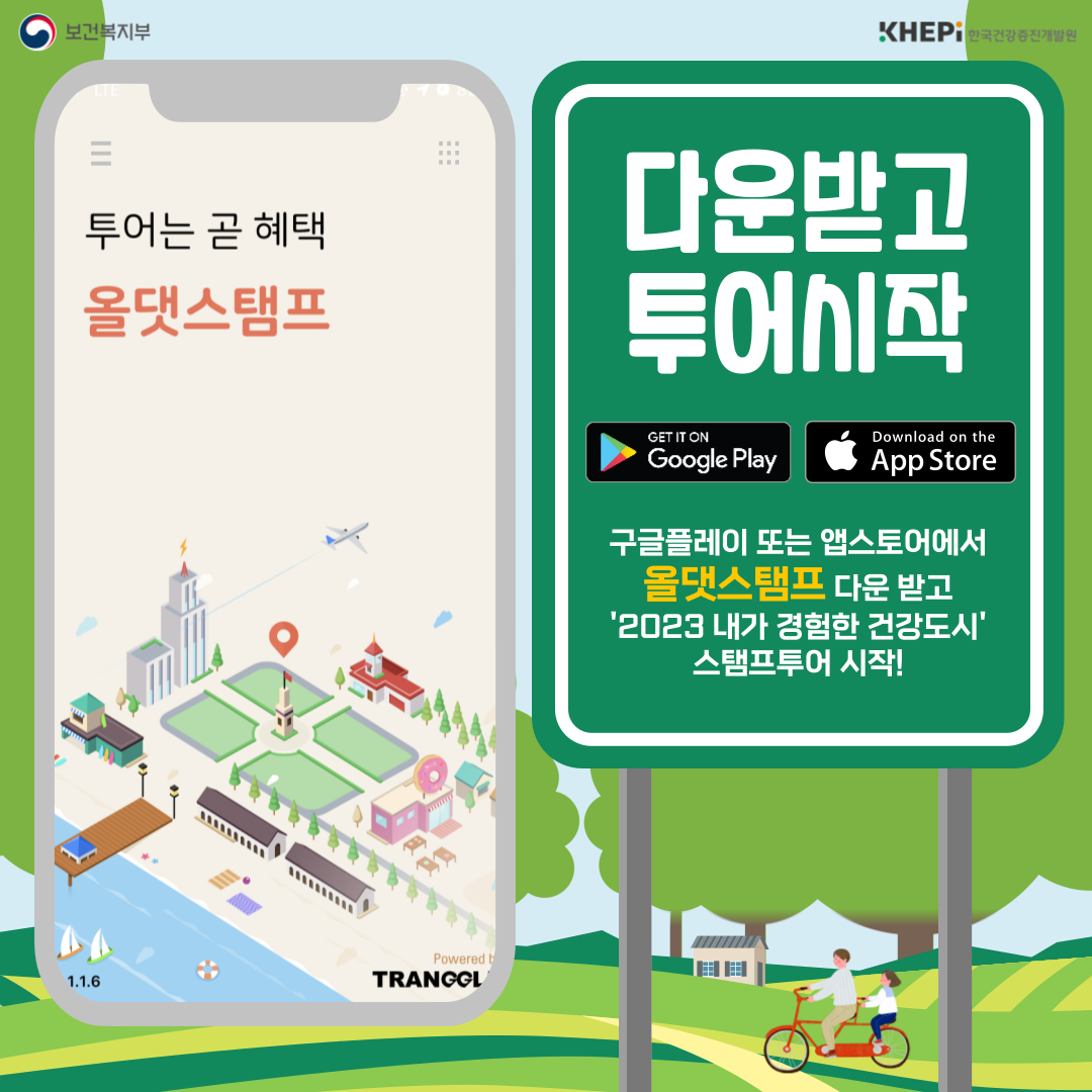 구글플레이 또는 앱스토어에서 올댓스탬프 다운 받고 '2023 내가 경험한 건강도시' 스탬프투어 시작!