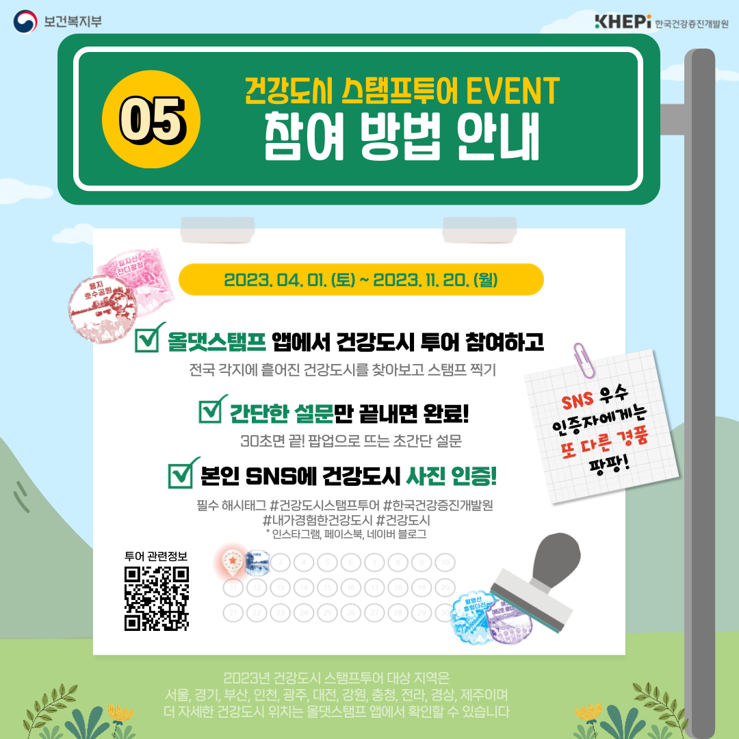 - 본인 SNS에 건강도시 사진 인증! - 필수 해시태그 : #건강도시스탬프투어 #한국건강증진개발원 #내가경험한건강도시 #건강도시