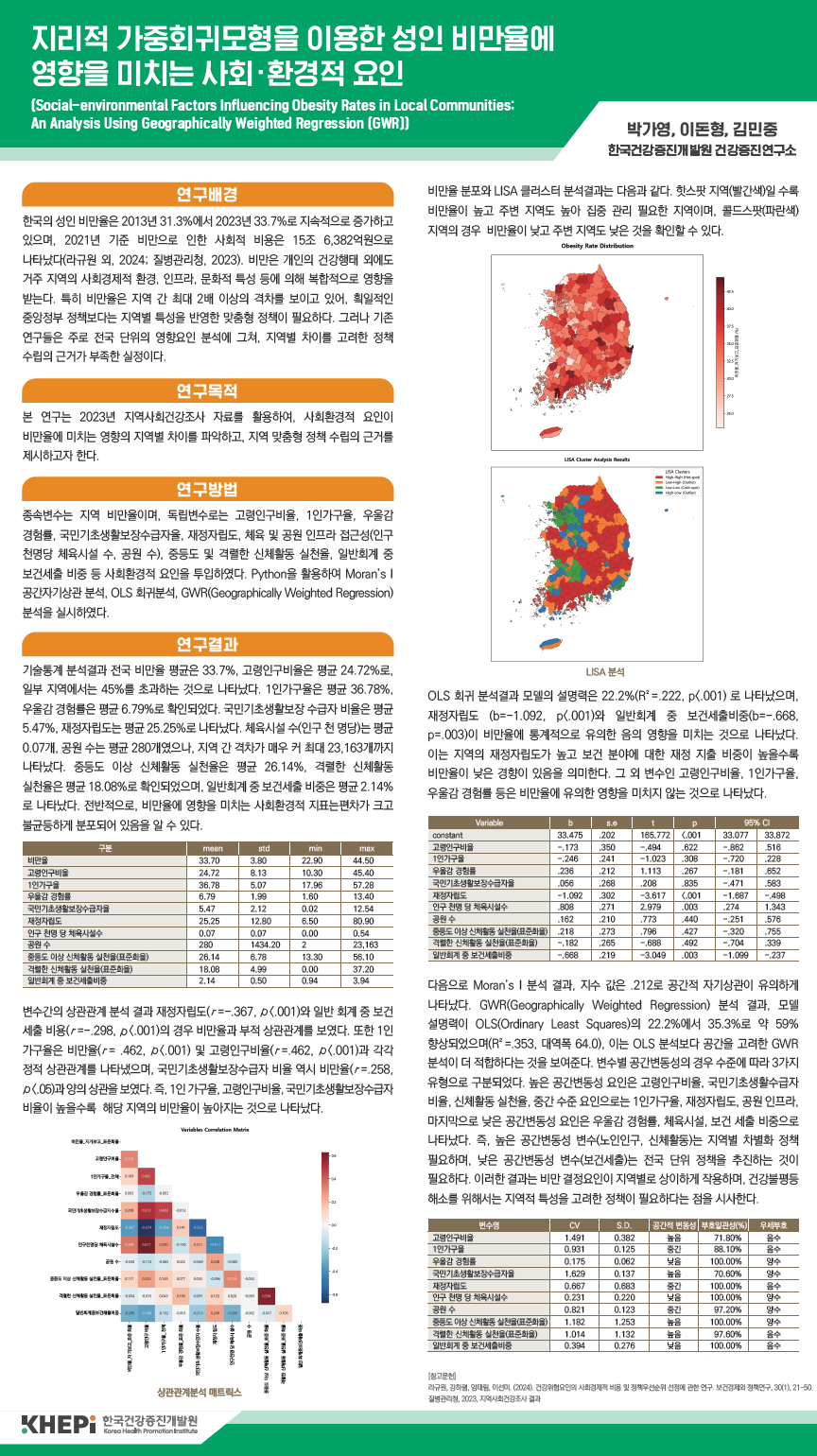 ㅇ 포스터 발표 2. 지리적 가중회귀모형을 이용한 성인 비만율에 영향을 미치는 사회환경적 요인 (우수 포스터상 수상)