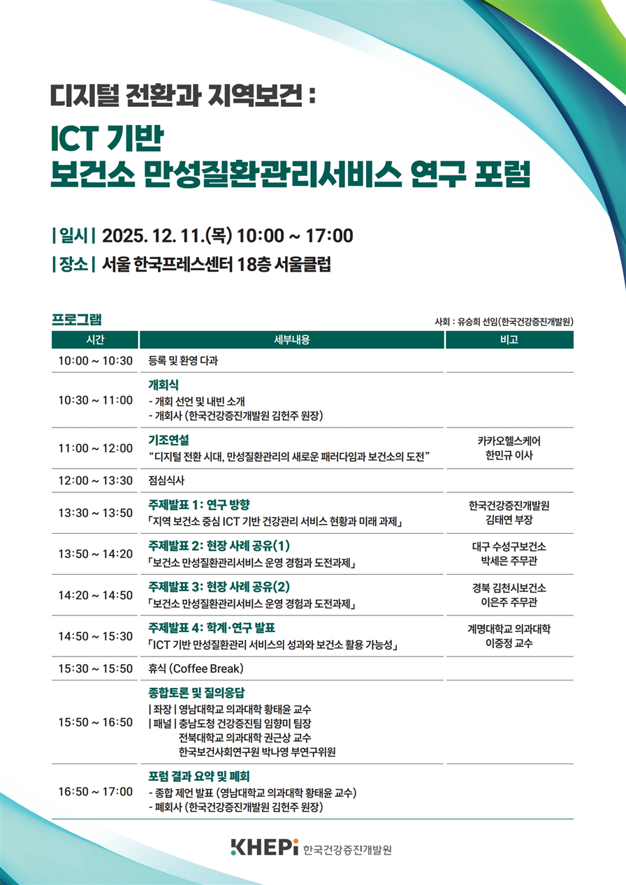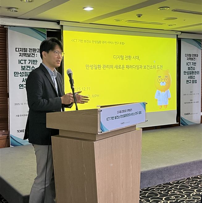 한국건강증진개발원은 12월 11일(목) 한국 프레스센터에서 ‘ICT 기반 보건소 만성질환관리 서비스 연구 포럼’을 개최했습니다.